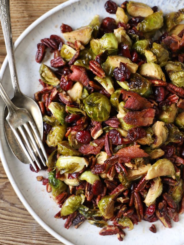 Roasted Brussels Sprouts with Cranberries, Bacon and Pecans
