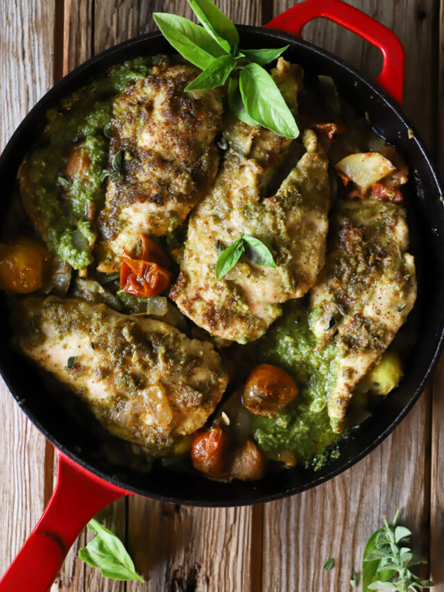 White Wine Pesto Chicken with Burst Heirloom Tomatoes & Zucchini
