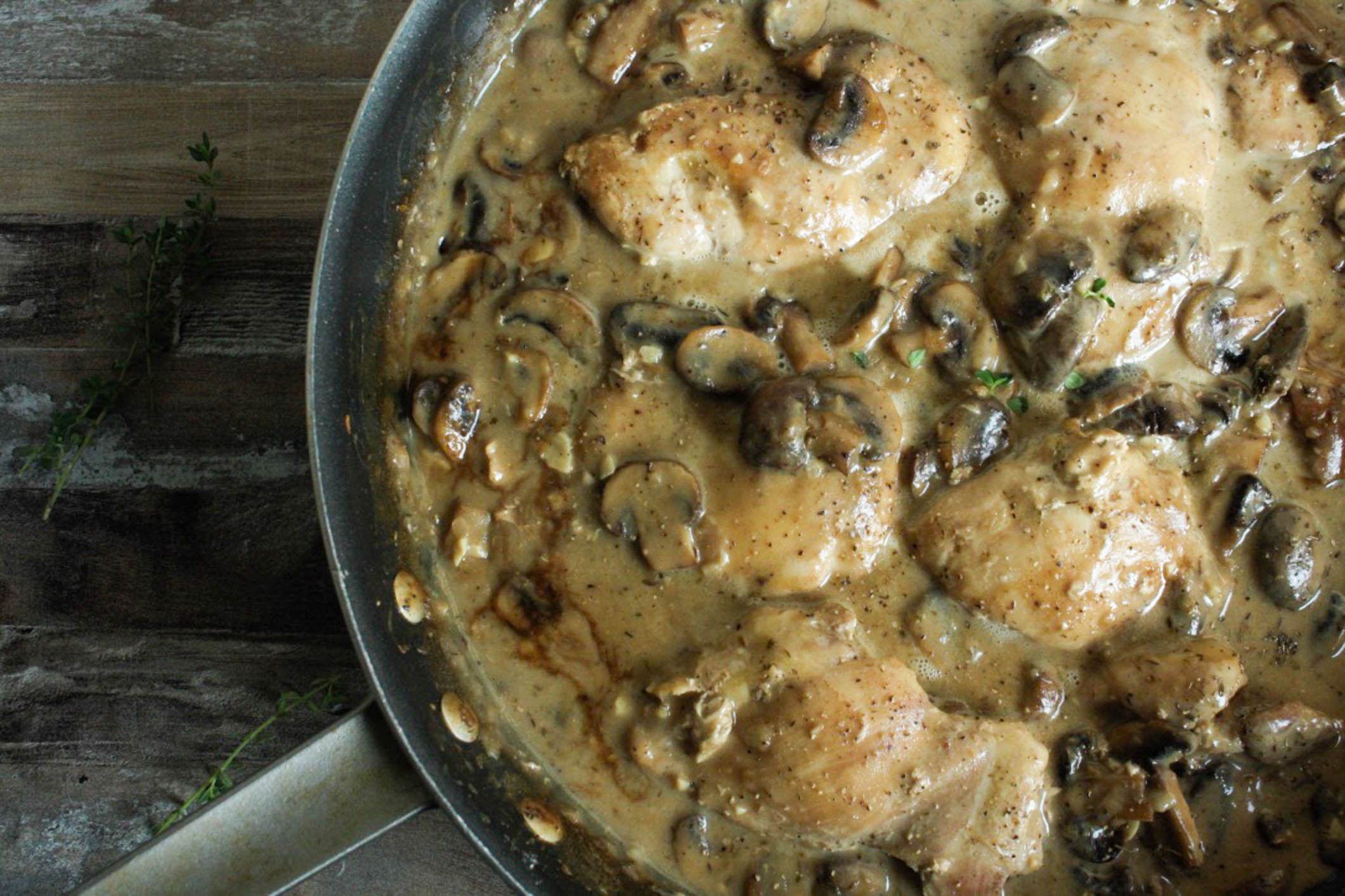 - To the same skillet, add the butter. Once the butter melts add the diced shallot and cook until the shallot becomes soft and starts to become translucent, about 3 minutes. Add the minced garlic and cook for 1 more minute. Next add the mushrooms. Season with the thyme, garlic powder, salt and pepper and cook the mushrooms until they begin to brown about 8 minutes.