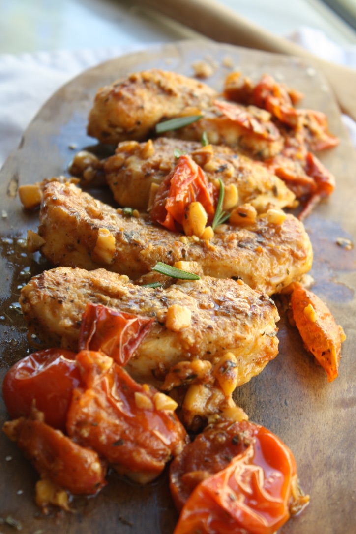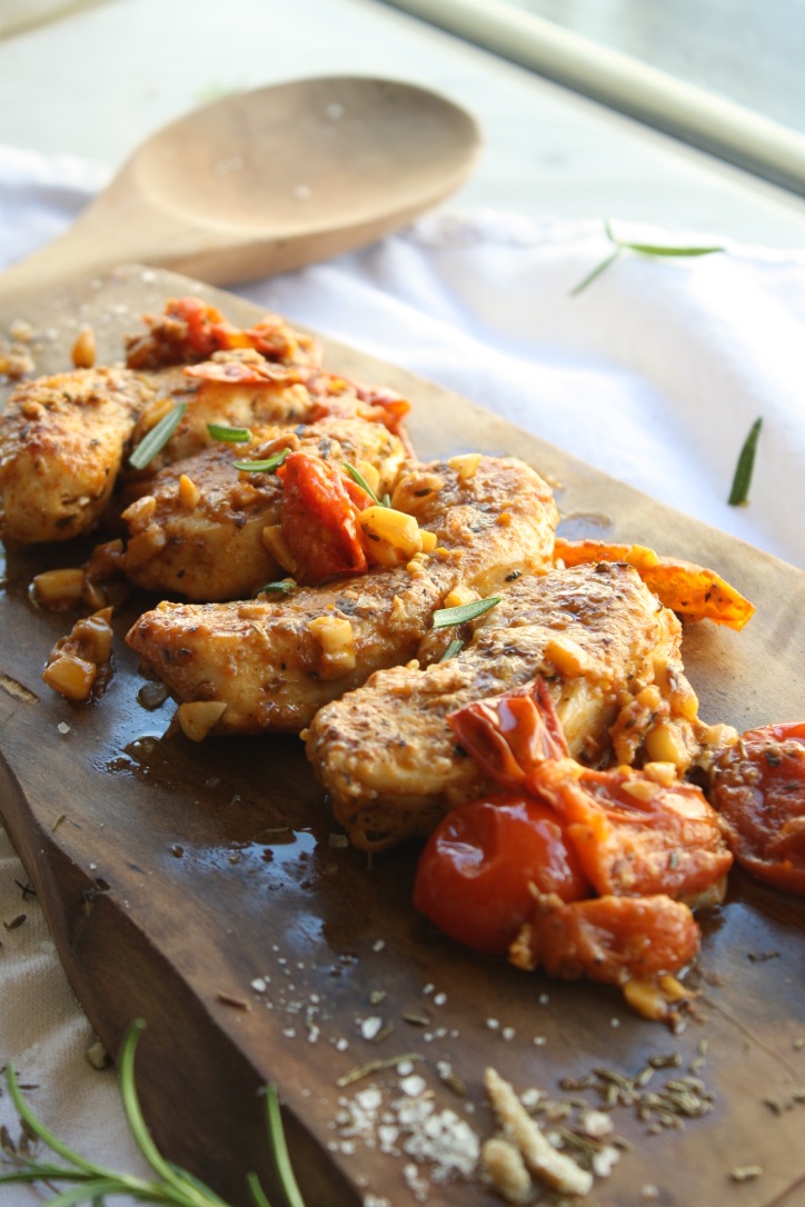 - Increase the heat to high, add the remaining 2 tablespoon butter until melted. Add the tomatoes. Cook stirring until the tomatoes begin to char and burst, about 5 minutes. Crush the tomatoes with a spatula to let out all the juices. Season to taste with salt and pepper. Add the chicken back to the pan and cook until the chicken is cooked through. Top with freshly grated parmesan cheese. Enjoy!