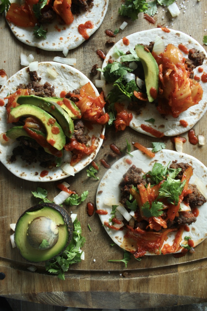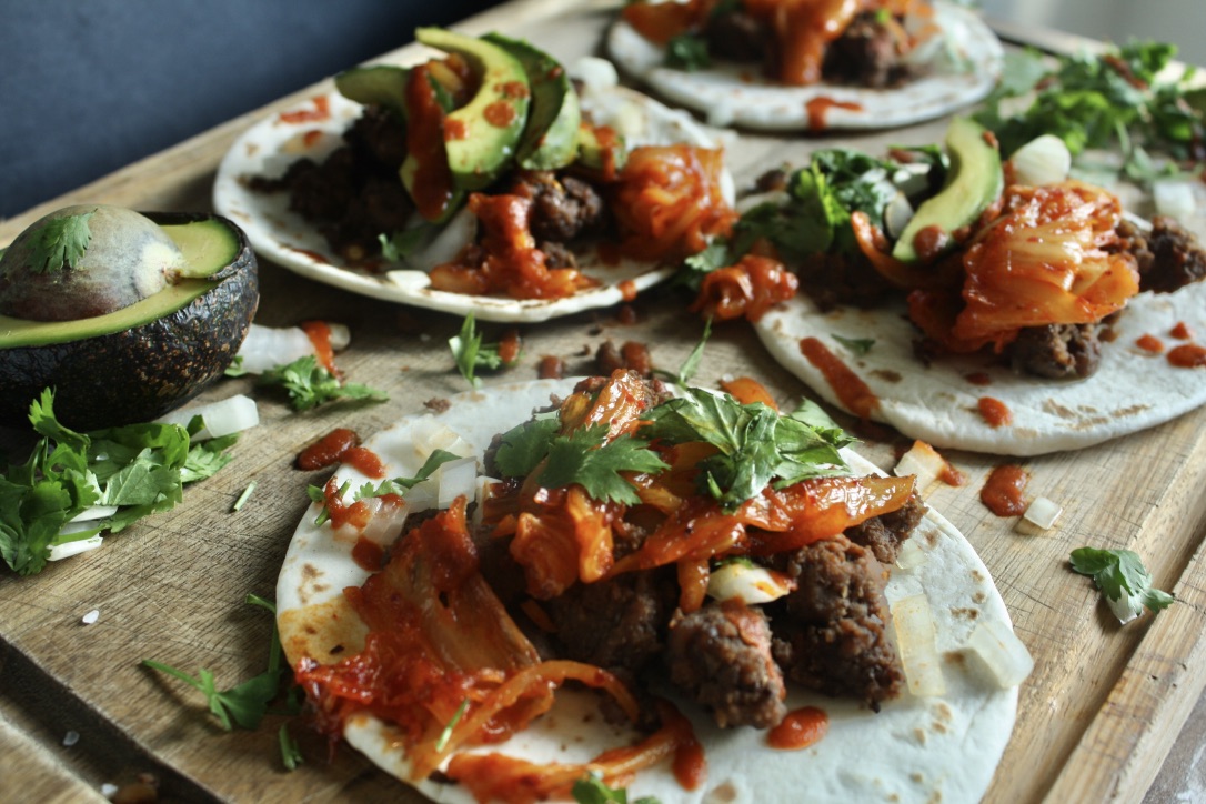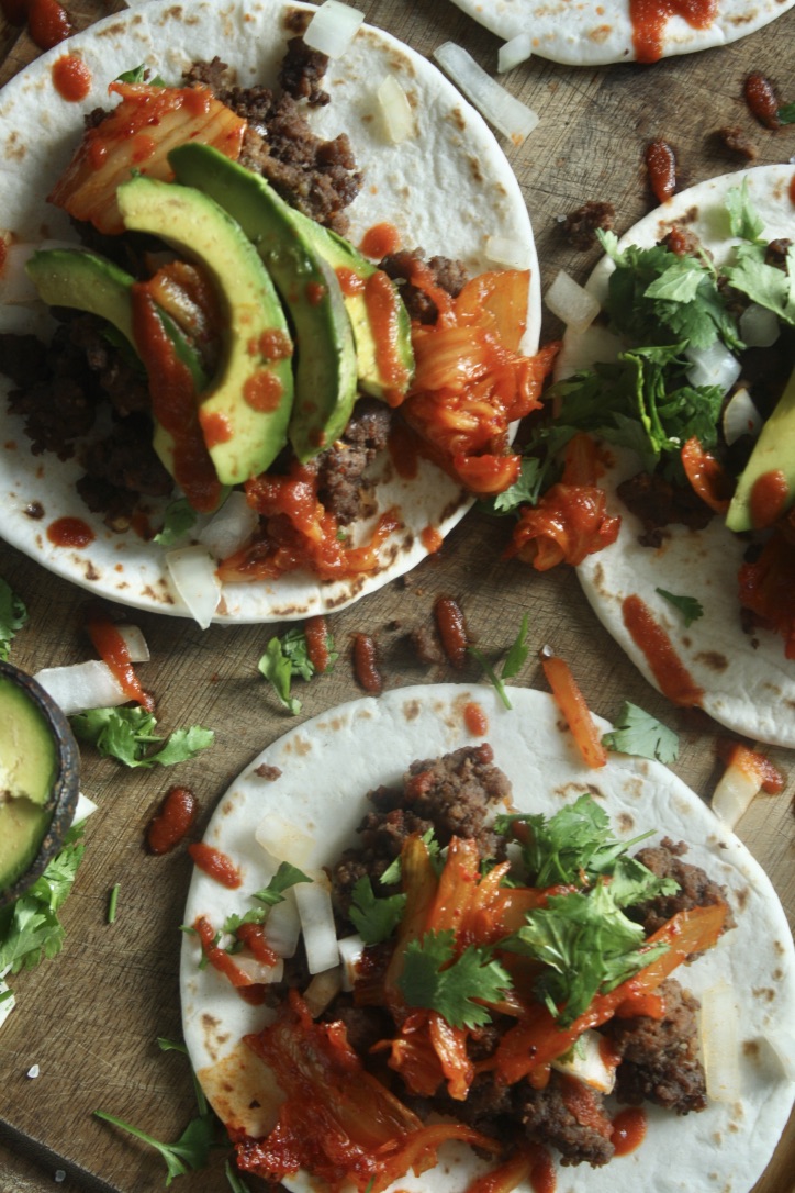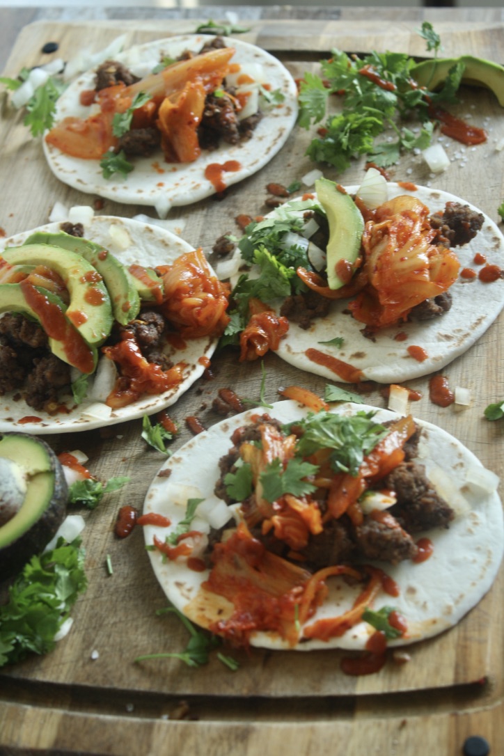 For the tacos you start by making a delicious sweet and spicy sauce. Then, you brown the ground beef, add that delicious sauce and allow to cook for a few minutes. After that is finished you add a splash of sesame seed oil to the pan, caramelize the kimchi, prepare any additional toppings (onion, avocado) assemble the tacos, and enjoy! We top these off with Sriracha drizzle for extra spiciness. Super simple and super flavorful. I would love to hear how this turns out for you! Leave a comment below. Happy cooking!