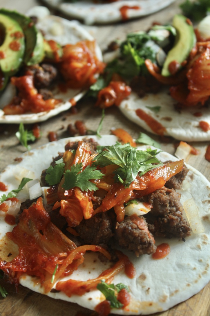Korean Inspired Street Tacos with Sweet & Spicy Caramelized Kimchi