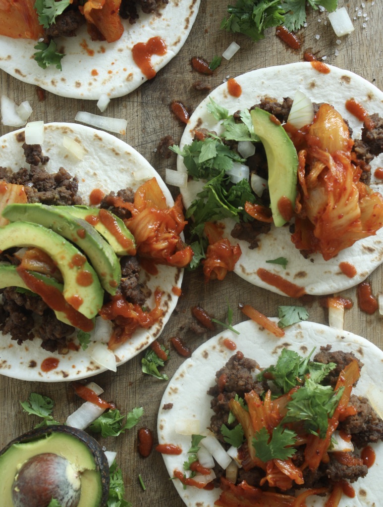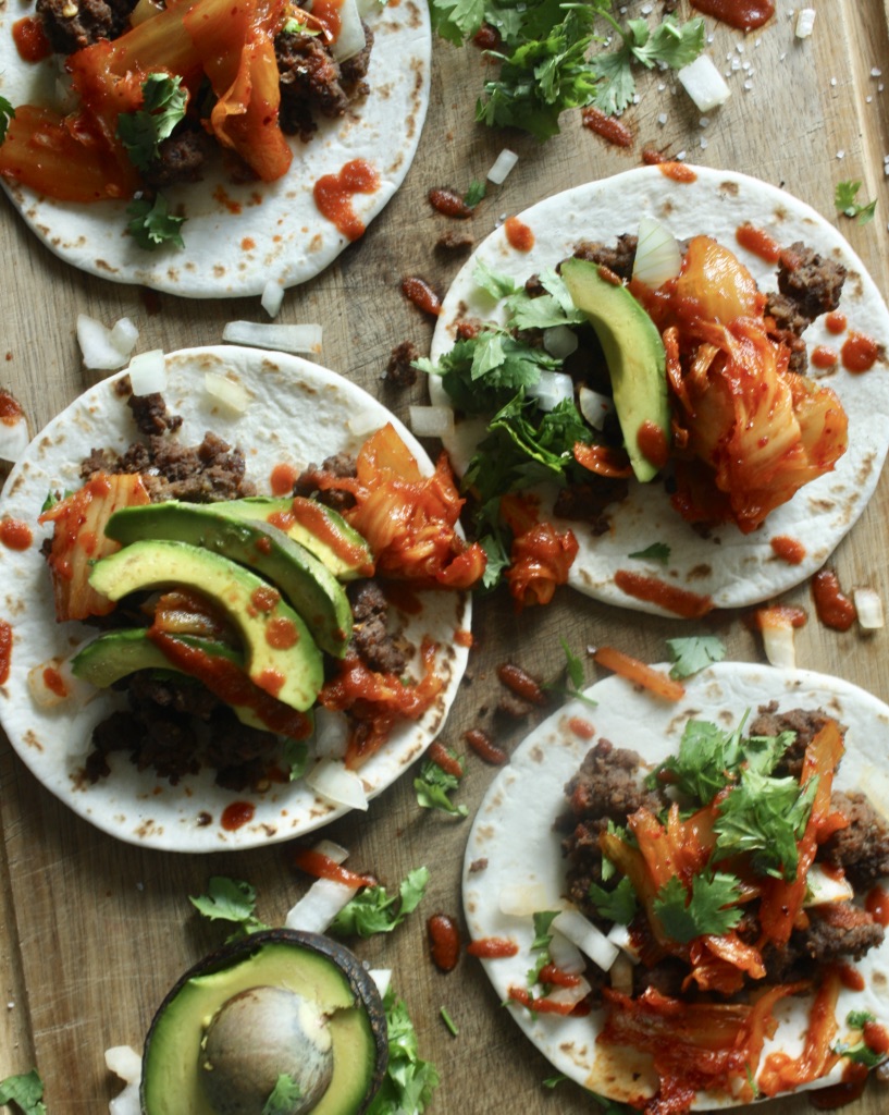 I’m not sure what I love more about these Korean inspired street tacos… the sweet and spicy ground beef, or the caramelized kimchi on-top. One thing is for sure, these tacos would definitely be incomplete without the kimchi that really sets them off. It adds such a delicious, authentic depth of flavor that is a must if you choose to make these tacos. If you’re new to Korean cuisine, you might be asking yourself, what is kimchi?![]()