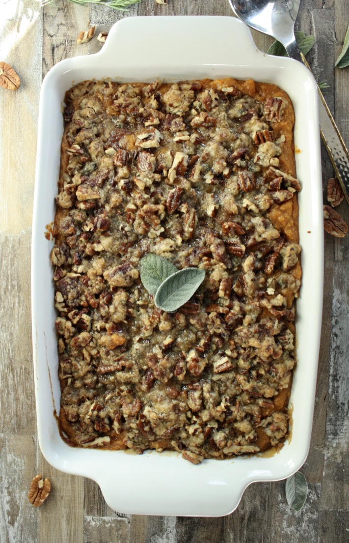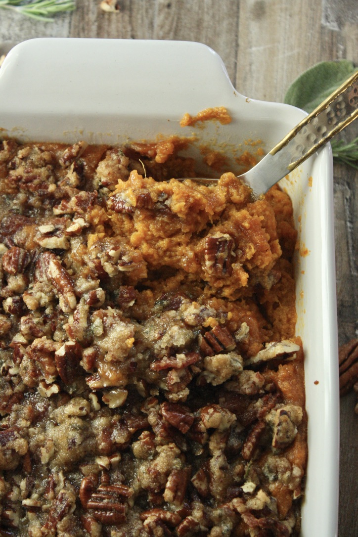 This Sweet Potato Casserole with Brown Sugar Bacon Pecan Topping is hands down one of the BEST sweet potato casserole you will ever make. Its sweet, savory, smokey and filled with hints of fresh rosemary and sage.